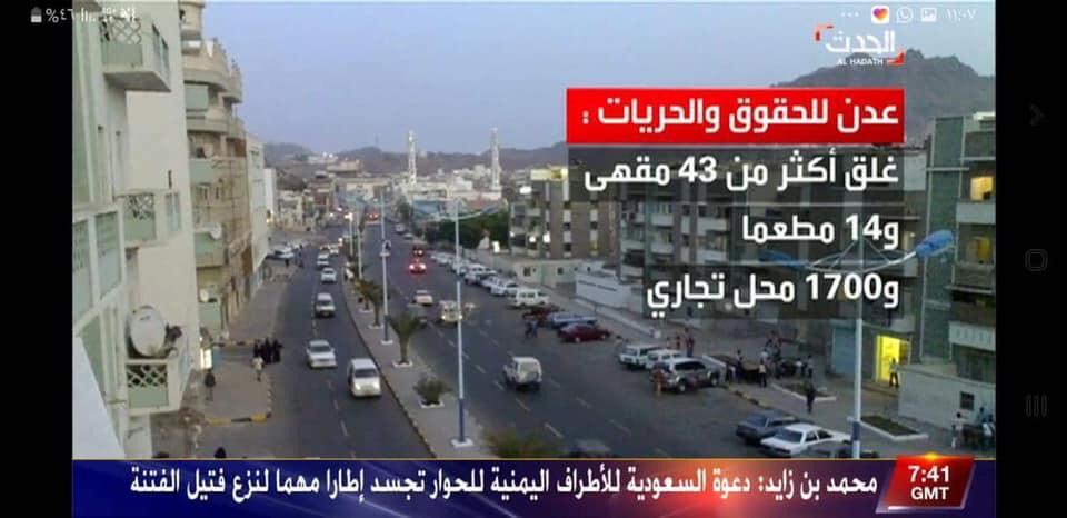 مبينا ان مسلحي مليشيات الانتقالي أغلقوا خلال الفترة الاخيرة أكثر من 43 كافتيريا و14 مطعما وألف وسبعمائة محل تجاري بمختلف مديريات مدينة عدن.