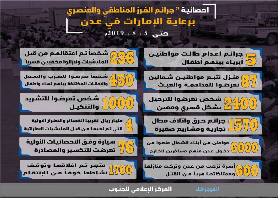 وذكر بأنه تم ترحيل أكثر من ألفي مواطن من عدن بشكل قسري وغير قانوني وتشريد أكثر من ألف أسرة وتدمير وحرق ألف ومئتين بسطة تجارية بالمدينة