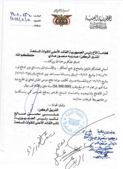 وقال المصدر أن توجيهات رئيس الجمهورية الصادرة بتاريخ 5/8/2019 وتوجيهات رئيس الوزراء الصادرة بتاريخ 22/8/2019 لوزير المالية بشأن موازنة علاج جرحى الجيش الوطني لم تنفذ والموازنة لم تصرف حتى يومنا هذا