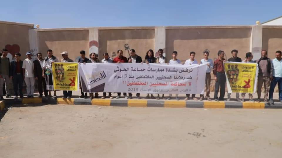 نظم العشرات من الصحفيين والنشطاء الاعلاميين في مدينة مأرب اليوم ، وقفة احتجاجية للتنديد بمايتعرض له الصحفيين المختطفين في سجون المليشيات الحوثية الانقلابية في صنعاء من محاكمات هزلية لاشرعية ولا صفة قانونية لها .
