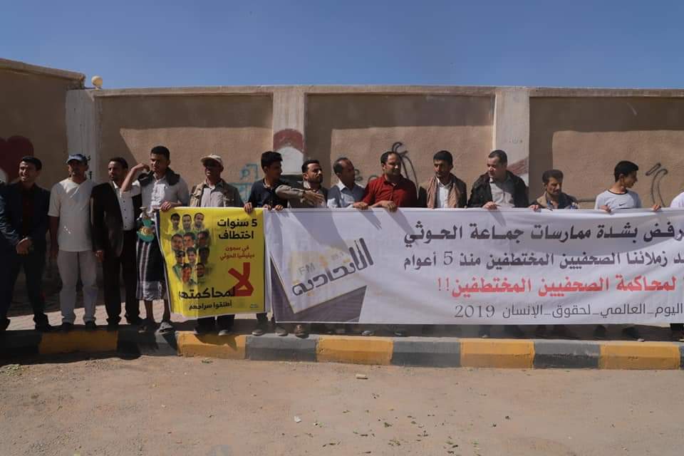 وناشدوا ،الإتحاد الدولي للصحفيين وإتحاد الصحفيين العرب و كافة المنظمات الحقوقية المعنية بحقوق الإنسان  لممارسة الضغط على مليشيات الحوثي للإفراج عن الصحفيين المختطفين لديها وكافة المعتقلين في سجونها.