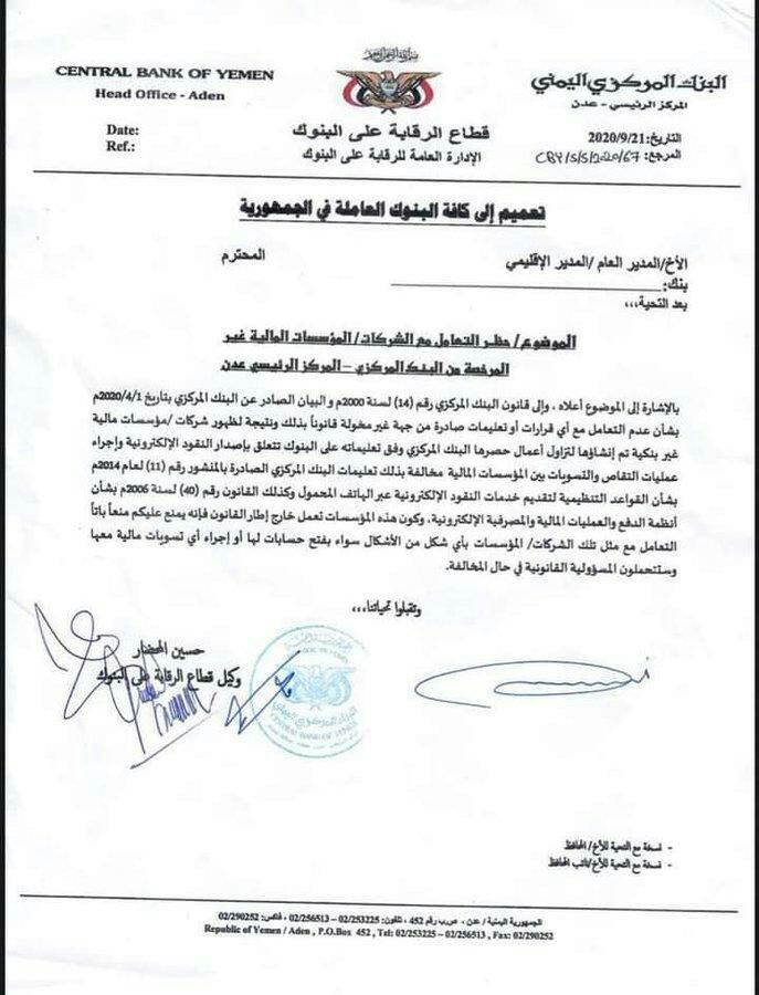 وفي التعميم حذر وكيل قطاع الرقابة على البنوك حسين المحضار، جميع البنوك العاملة في اليمن من التعامل مع هذه الشركات والمؤسسات المالية تعمل في مجال المدفوعات وإصدار النقود الالكترونية او التعاون معها بأي شكل من الأشكال، سواء بفتح حسابات لها أو إجراء أي تسويات مالية معها.