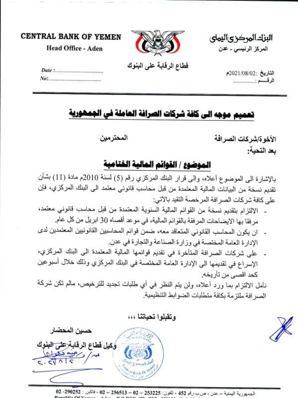 وحث البنك في التعميم الصادر عنه اليوم – تلقى الانباء اونلاين نسخة منه- جميع شركات الصرافة في كل المحافظات بسرعة موافاة البنك بنسخة من بياناتها المالية من قبل محاسب قانوني معتمد لدى الإدارة المختصة في وزارة الصناعة والتجارة في عدن في موعد أقصاه 30 أبريل من كل عام إستناداً إلى المادة (11) من قرار البنك المركزي رقم (5) لسنة 2010م