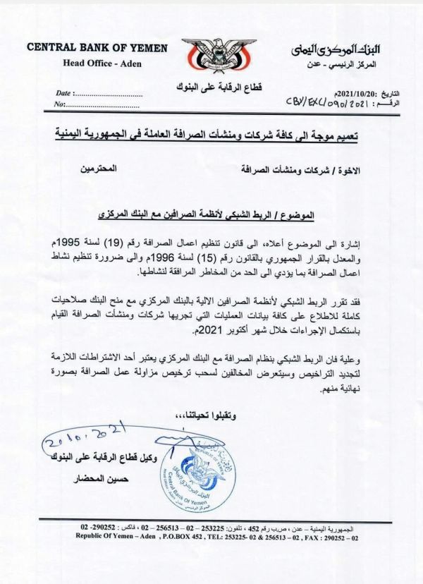 أصدر البنك المركزي اليمني المركز الرئيس – عدن- أمس السبت، تعميمًا إلى شركات ومنشئات الصرافة، للربط الشبكي مع البنك؛ لتنظيم نشاط أعمال الصرافة.