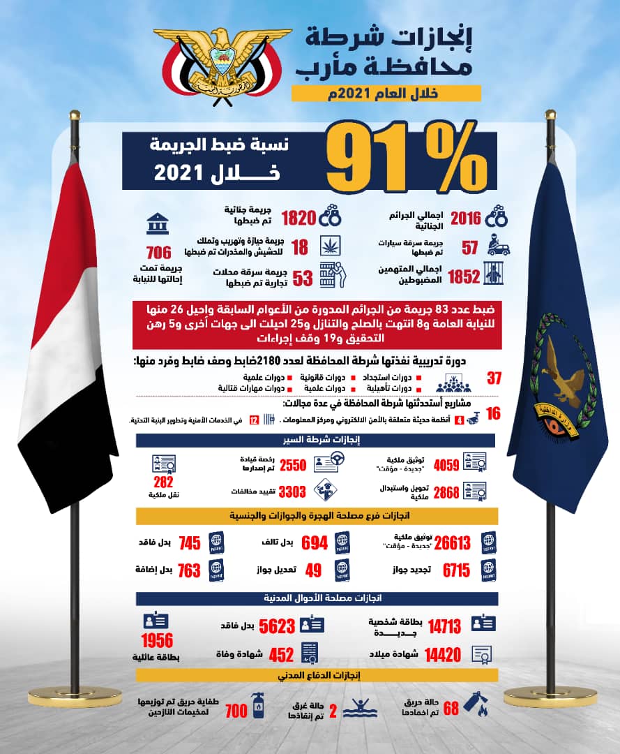 وذكرت شرطة محافظة مأرب في تقريرها ، أن إجمالي الجرائم الجنائية التي سجلت خلال العام الماضي بلغت 2016 جريمة ضبطت منها 1820 بالإضافة إلى الجرائم المدورة من الأعوام السابقة وعددها 83 جريمة