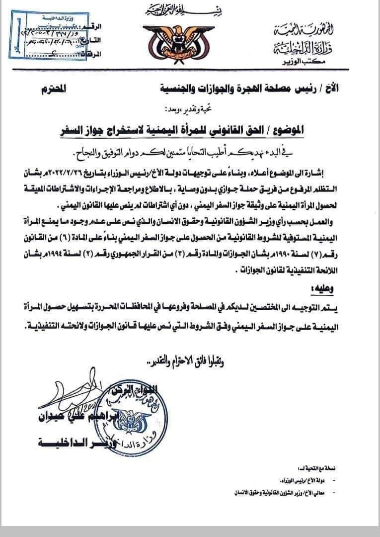 والزمت قيادة وزارة الداخلية في توجيهاتها رئيس مصلحة الهجرة والجوزات والجنسية في العاصمة المؤقتة عدن وفروع المصلحة في المحافظات بتسهيل حصول المرأة اليمنية على جواز السفر اليمني وفق الشروط التي نصت عليها المادة السادسة من قانون الجوازات لعام 1990 والمادة الثالثة من القرار الجمهوري لعام 1994 بشأن اللائحة التنفيذية لقانون وثائق الجوزات